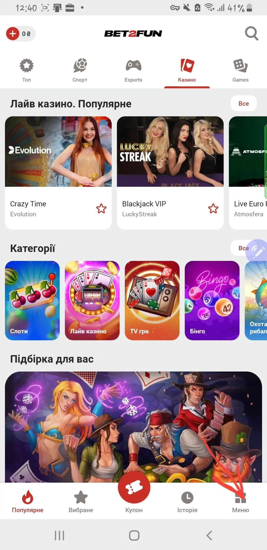 Оберіть підрозділ "Казино", що розташований вгорі екрану