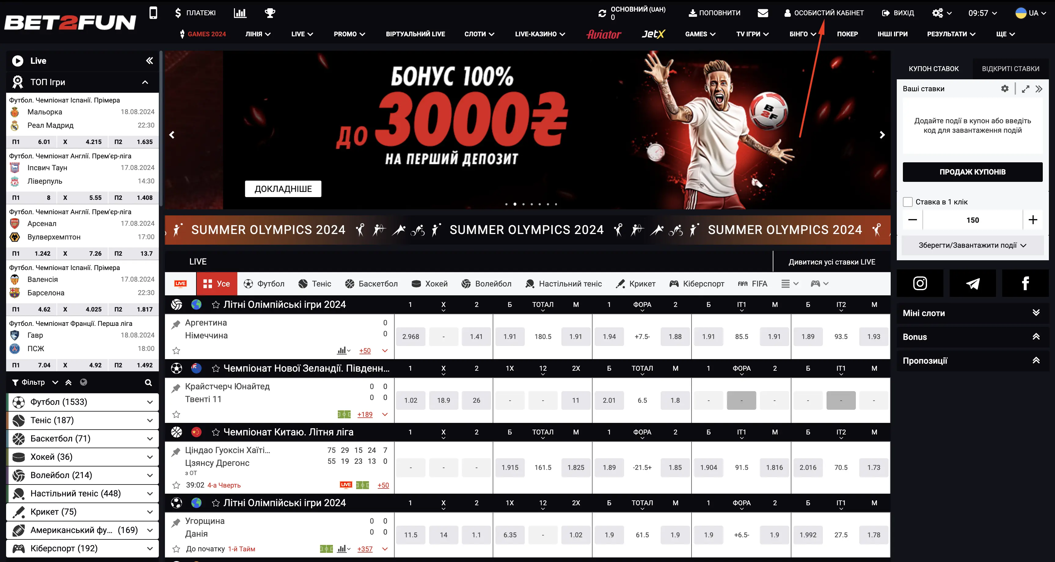 Натисність кнопку "Особистий кабінет", яка розміщена у верхній частині сайту