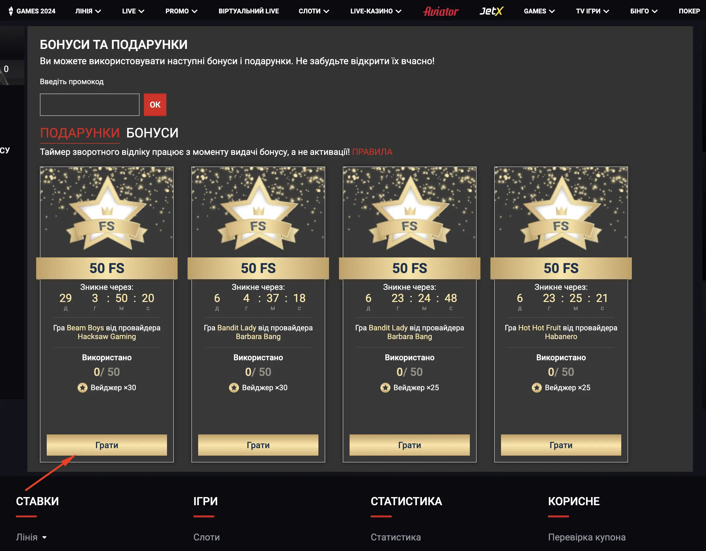 Натисніть кнопку "Промо" та саме там Ви зможете побачити актуальні бонуси та подарунки